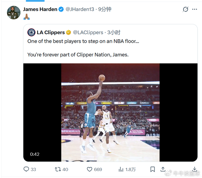 此外,哈登还转发了快船队致敬自己的视频,快船队写道:“历史上最伟大的球星之一,你将永远是快船国度的成员!”